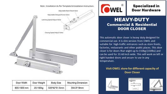 Extra Heavy Duty/UL Listed Commercial Automatic Door Closer, Cast Iron Body & Forged Steel Arm with Adjustable Speed, ANSI Certification and 3hours fire ratings